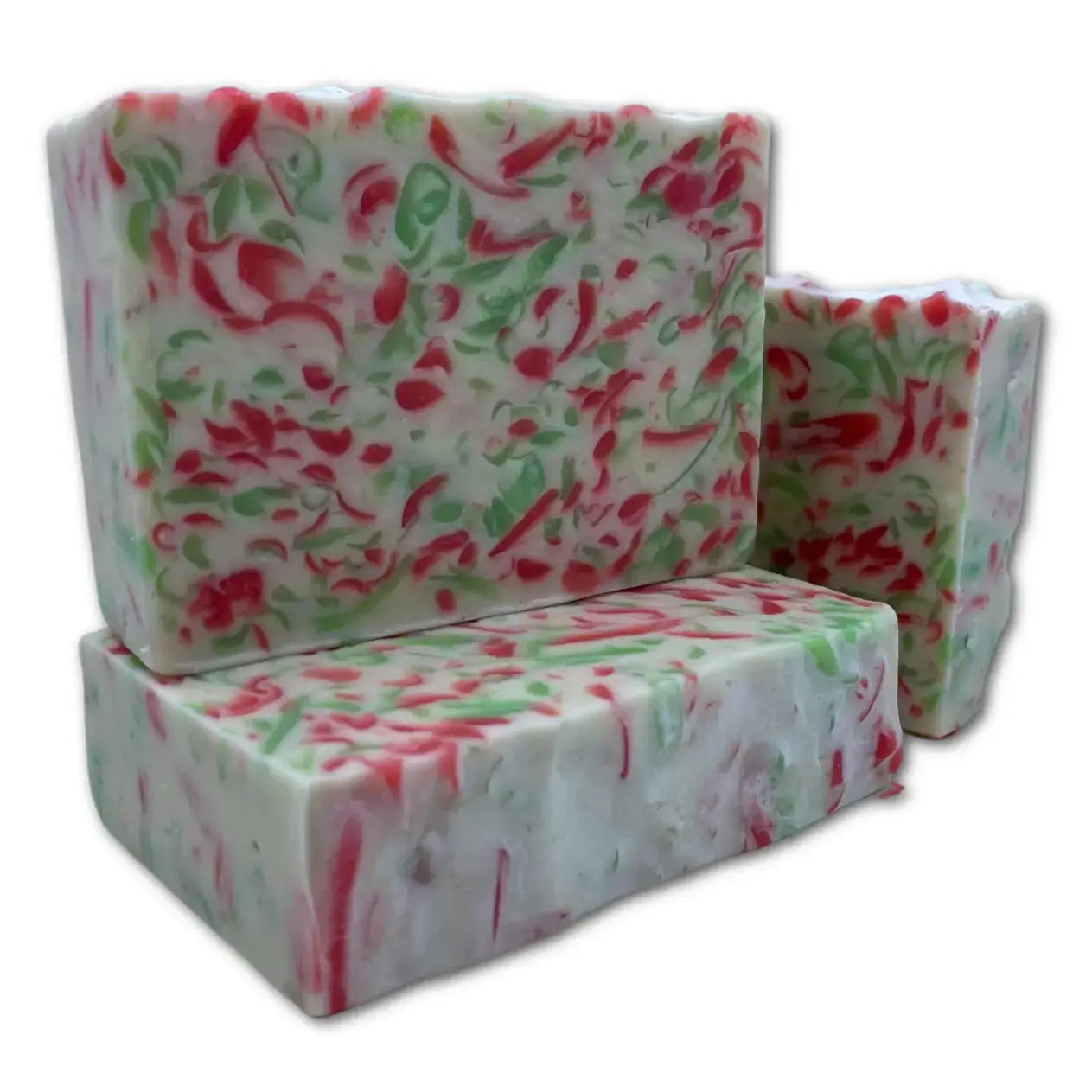 Christmas Mint - Morning frost, Mint, candied peppermint. Ingredients: Raw Goat Milk, Olive Oil, Coconut oil, Palm Oil, Sodium Hydroxide, Avocado Oil, Castor Oil, Shea Butter, Fragrance (paraben-free and phthalate-free), Colorant (Mica Powder).