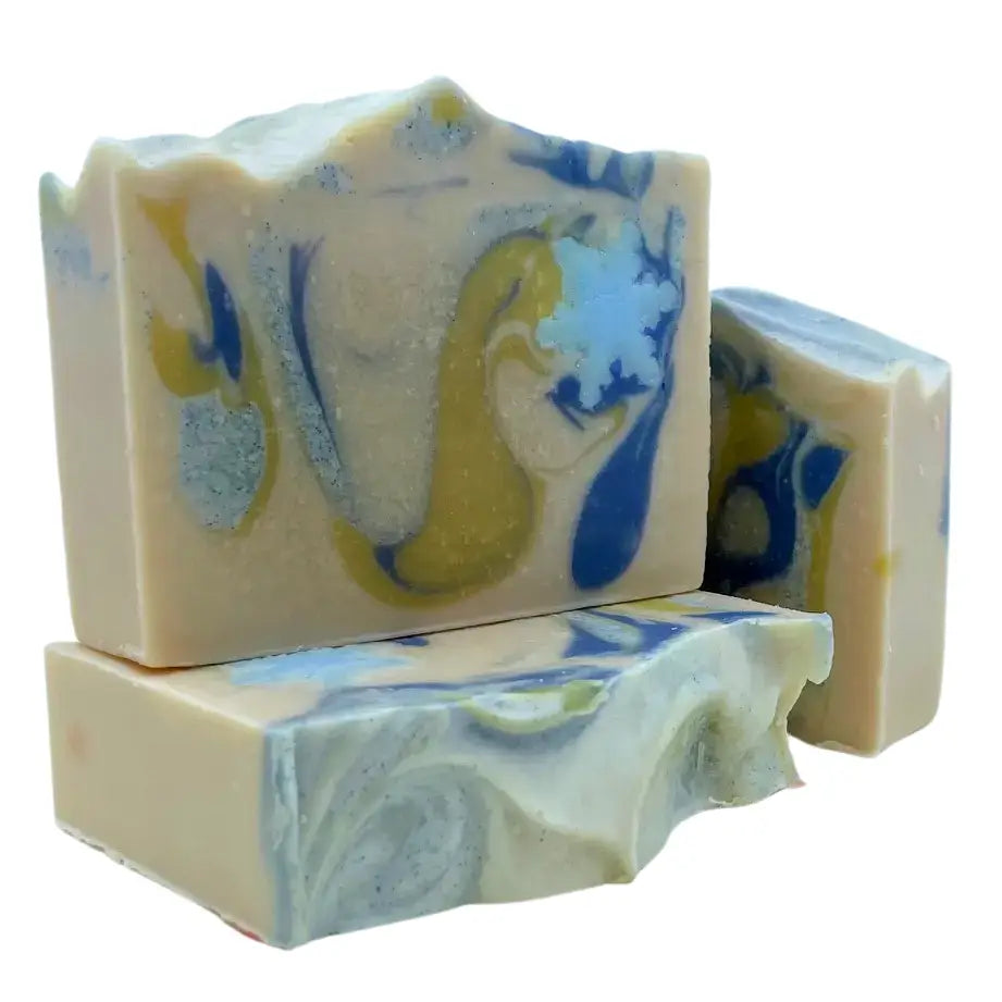 Snowflake and Citrus - Blend of frozen lemon zest, fresh squeezed tangerine juice and sugared snow crystals for that tangy, cool scent Ingredients: Raw Goat Milk, Olive Oil, Coconut oil, Palm Oil, Sodium Hydroxide, Avocado Oil, Castor Oil, Shea Butter, Fragrance (paraben-free and phthalate-free), Colorant (Mica Powder).