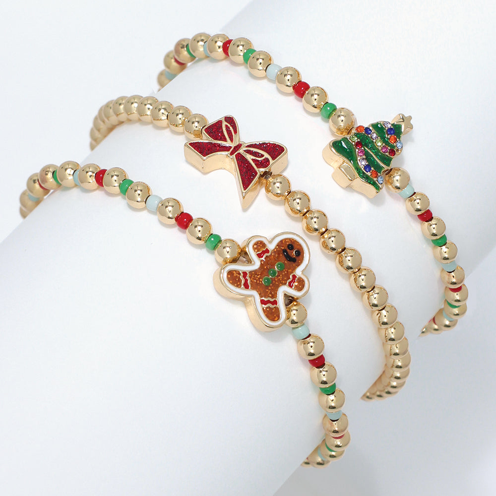 Add a festive touch to your look with this playful Holiday Charm Bracelet. Featuring gold beads strung on a comfortable stretch band, it’s accented with cheerful red and green highlights. Choose your favorite charm—a bow, gingerbread, or Christmas tree—to sparkle with seasonal joy wherever you go. Perfect for holiday parties or gifting cheer!