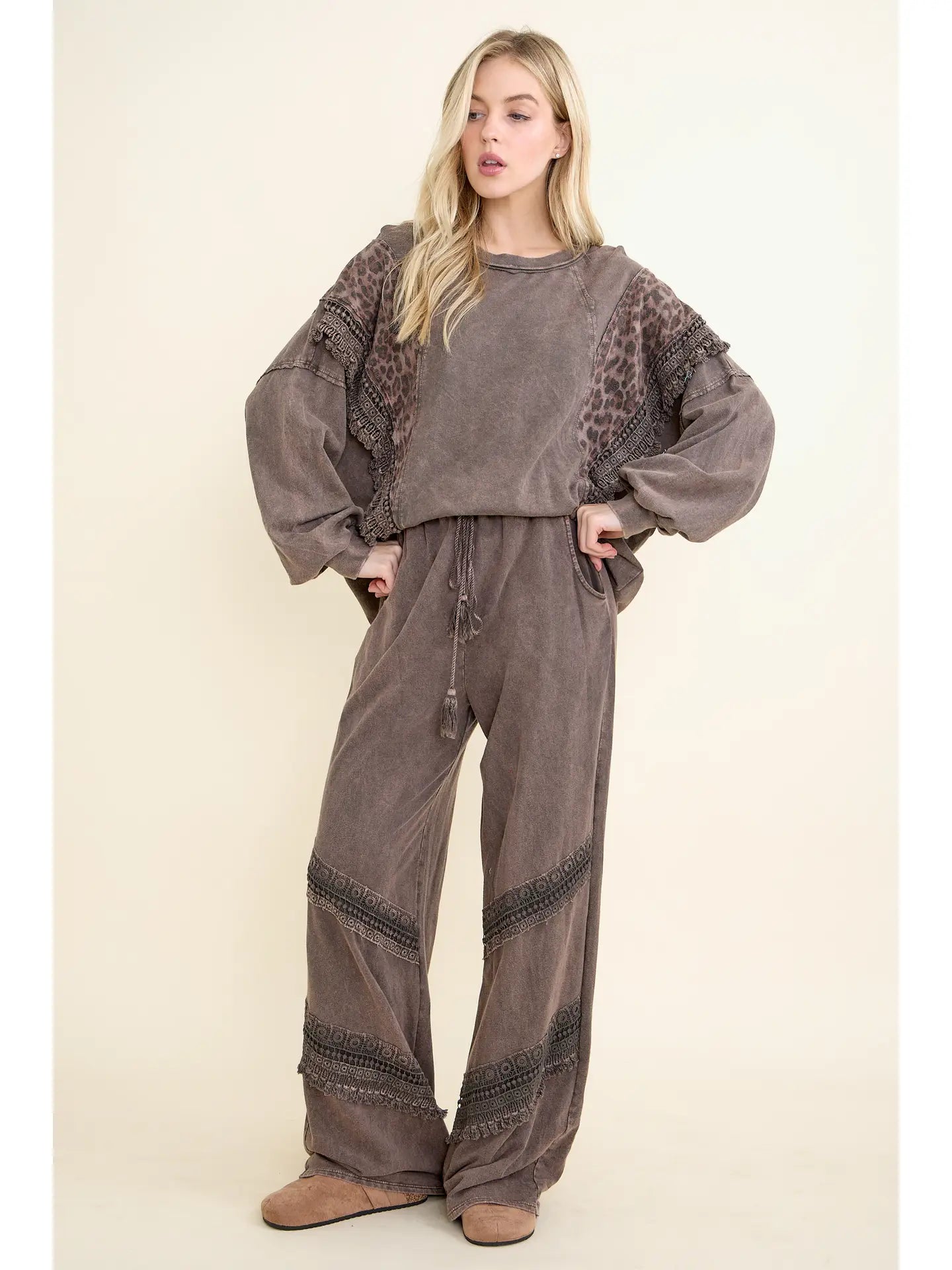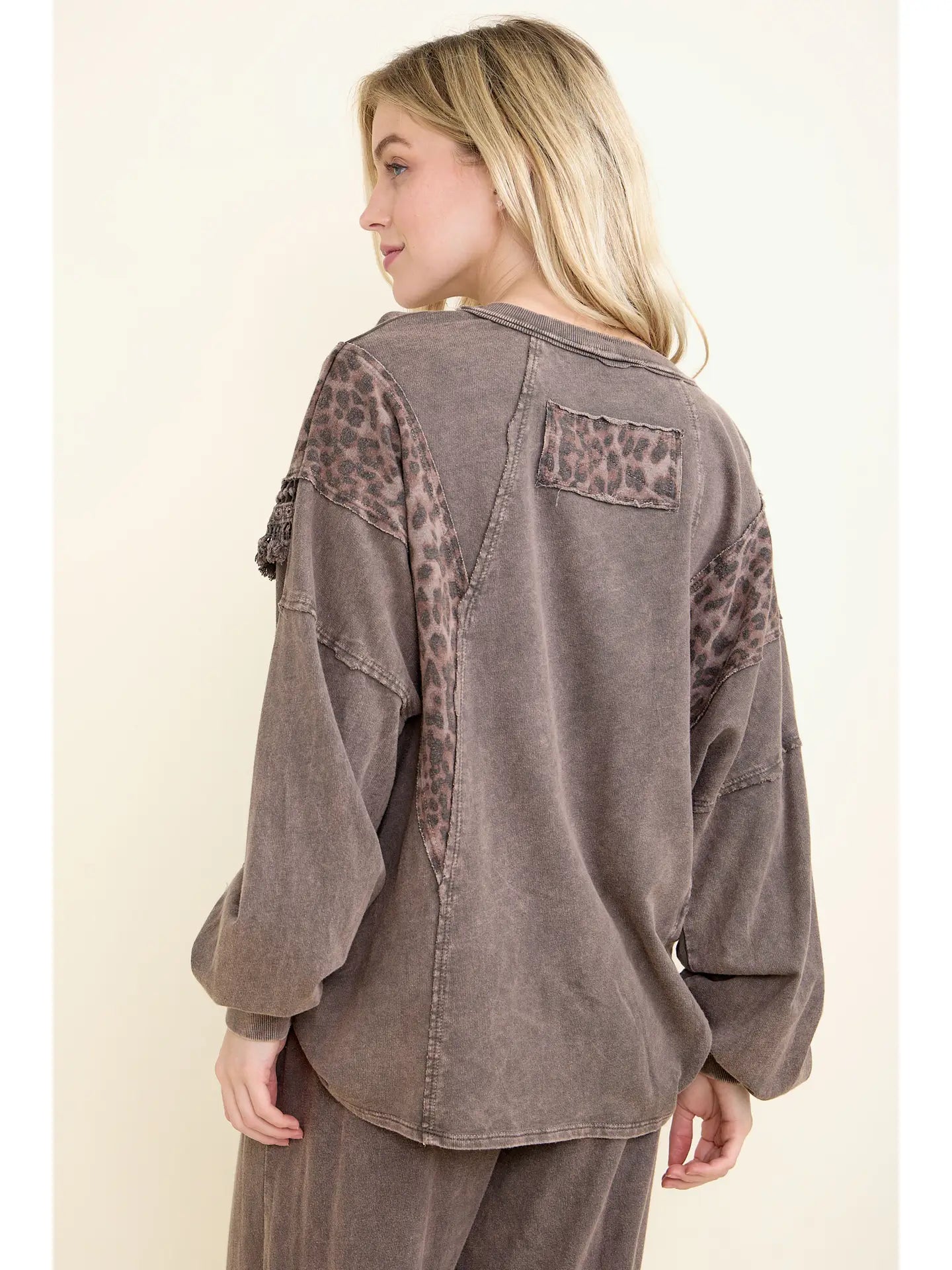 Unleash your wild side with this mineral washed cheetah leopard fringe tassel top in a chic ash oak hue. The soft, lived-in finish gives it an effortlessly cool vibe, while playful fringe and tassel details add movement and personality to every wear. Perfect for layering or styling solo, this statement piece brings a touch of untamed fun to your everyday wardrobe. Roar into any occasion with confidence and flair.