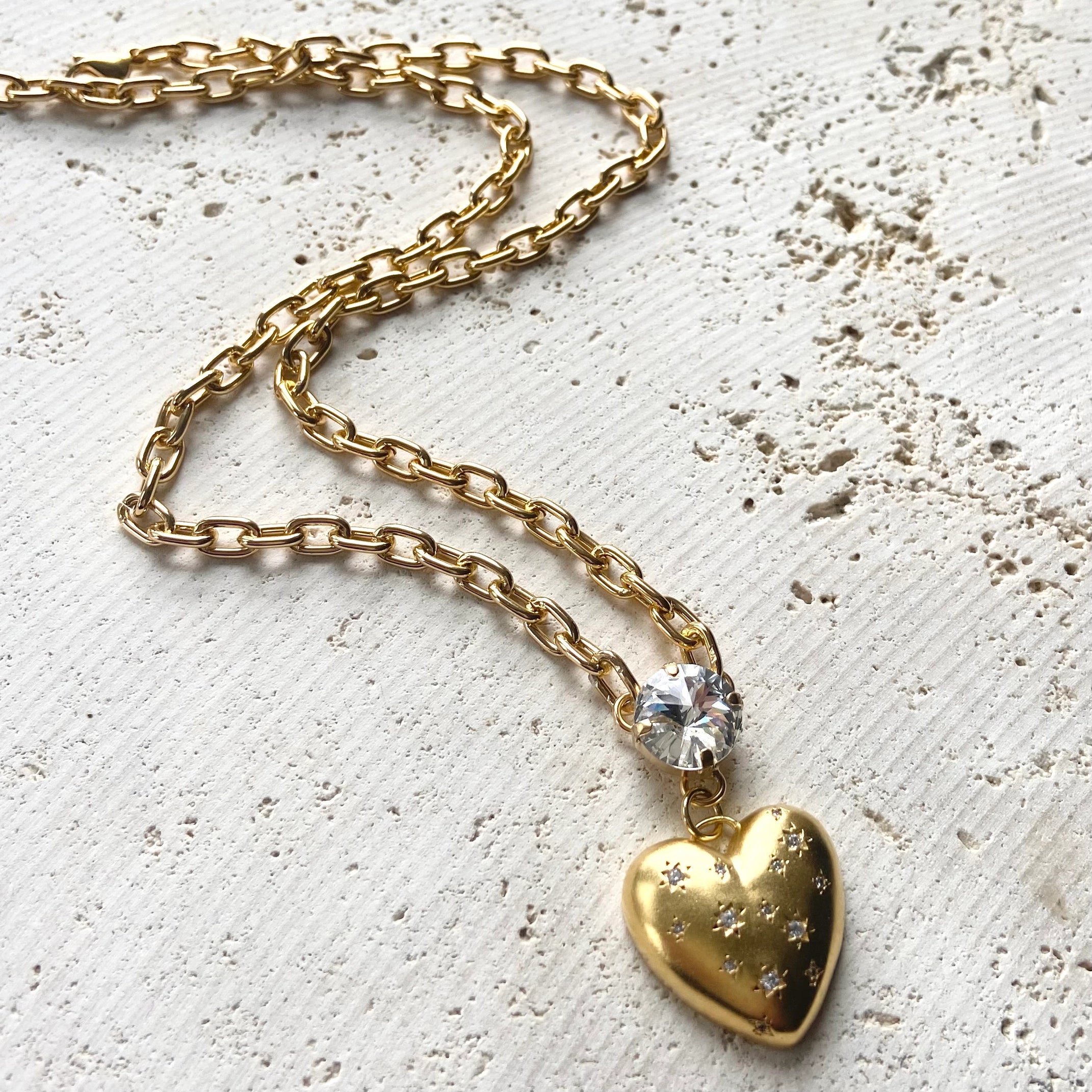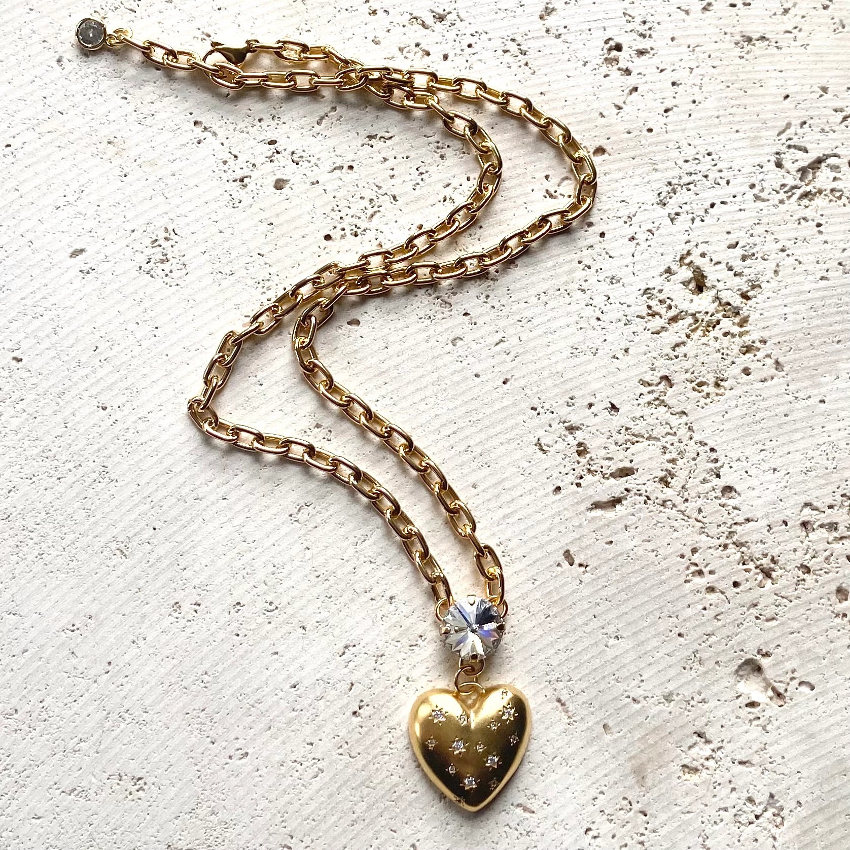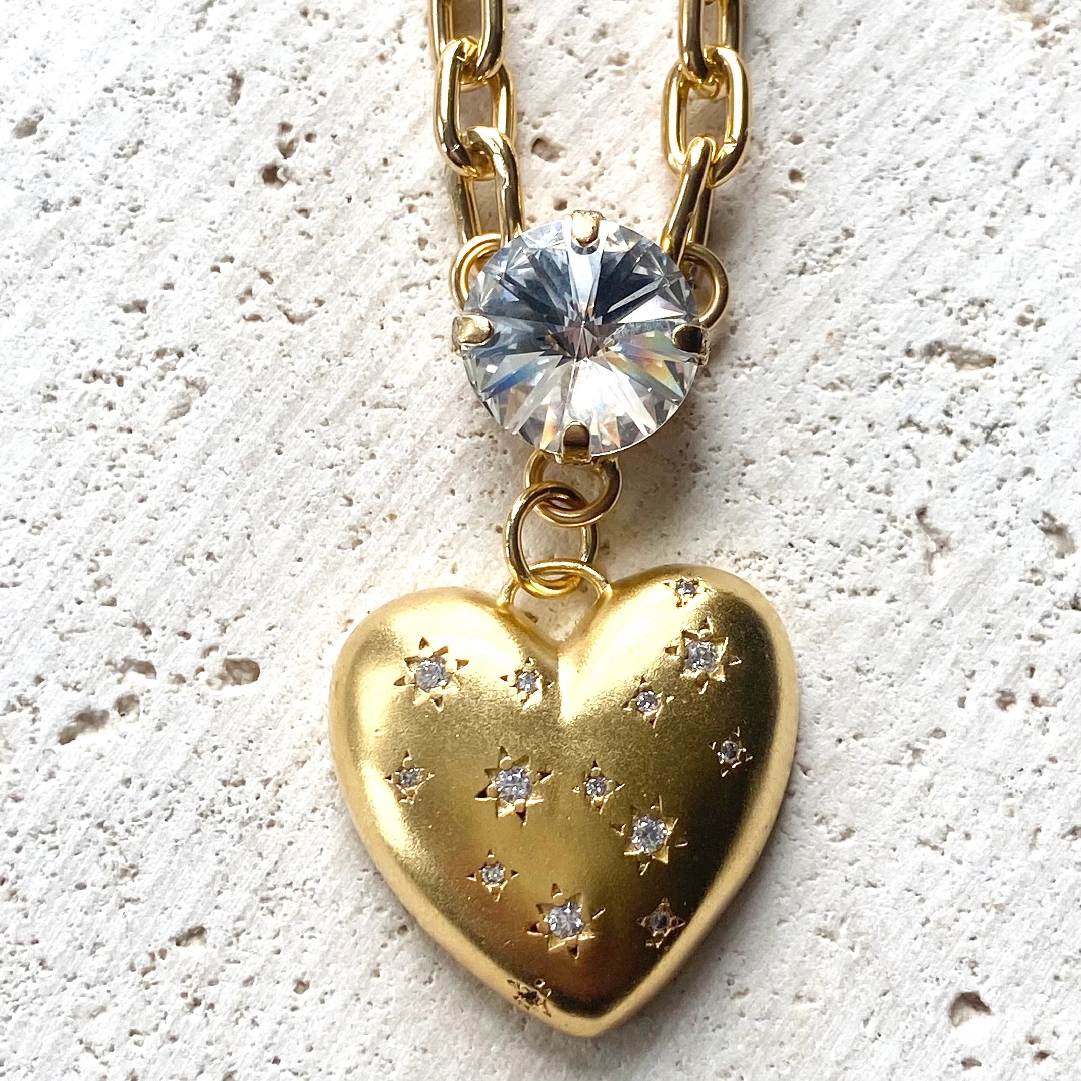 This necklace is so beautiful. The 19mm handcasted heart features multiple tiny sparkly clear crystal starbursts. This deluxe design features a 12mm Swarovski crystal connector and the chain is light weight aluminum. The chain is sweatproof and tarnish resistant.