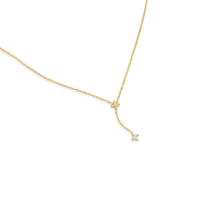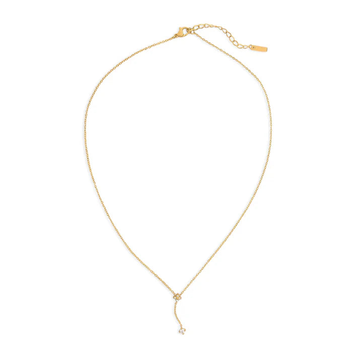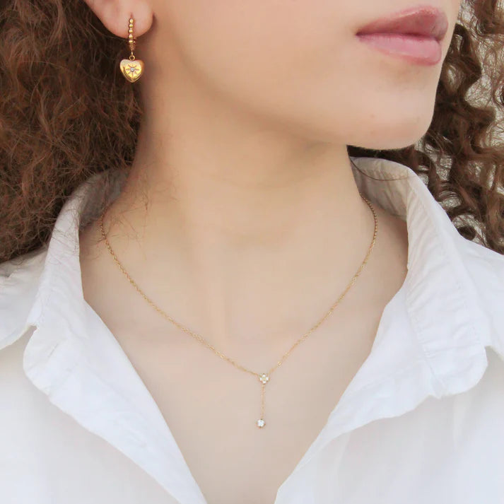 This dainty Water Resistant necklace showcases a delicate cubic zirconia floral charm paired with a round cubic zirconia stud, creating a balanced blend of organic charm and refined sparkle. The lightweight chain adds effortless grace, making it an ideal piece for layering or wearing solo as a subtle statement.