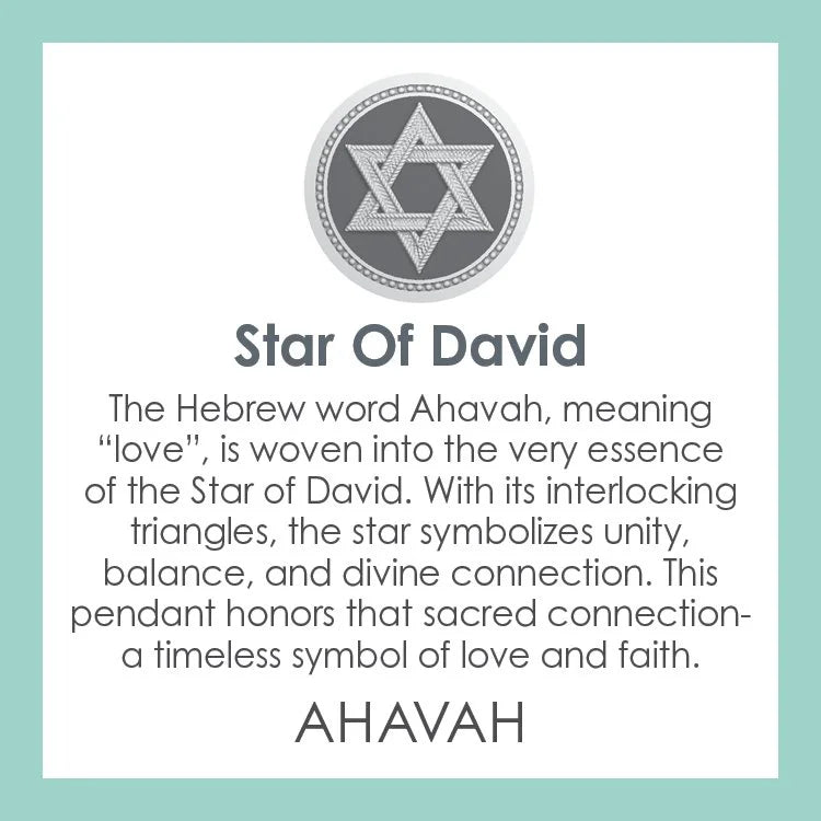 The Hebrew word Ahavah, meaning “love", is woven into the very essence of the Star of David. With its interlocking triangles, the star symbolizes unity, balance, and divine connection. This pendant honors that sacred connection- a timeless symbol of love and faith.