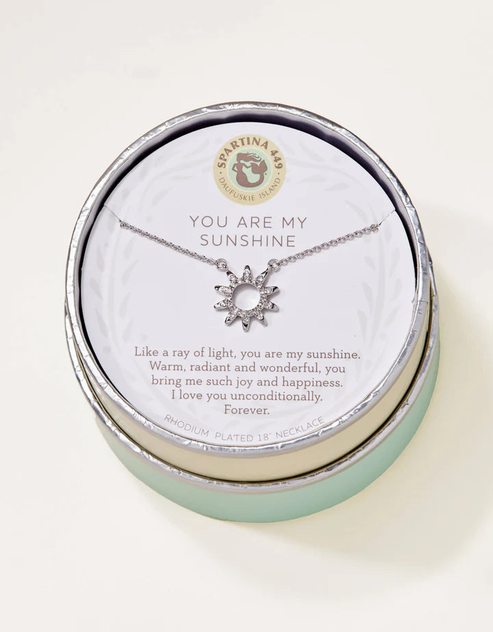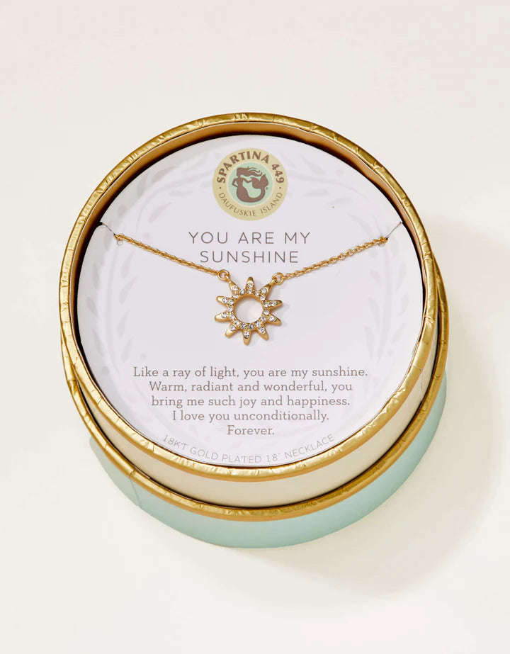 Wear our Sunshine Necklace as a reminder of unconditional love. Featuring a glass crystal studded sunshine charm, this special piece comes packaged inside a beautiful box with the message: "Like a ray of light, you are my sunshine. Warm, radiant and wonderful, you bring me such joy and happiness. I love you unconditionally. Forever."