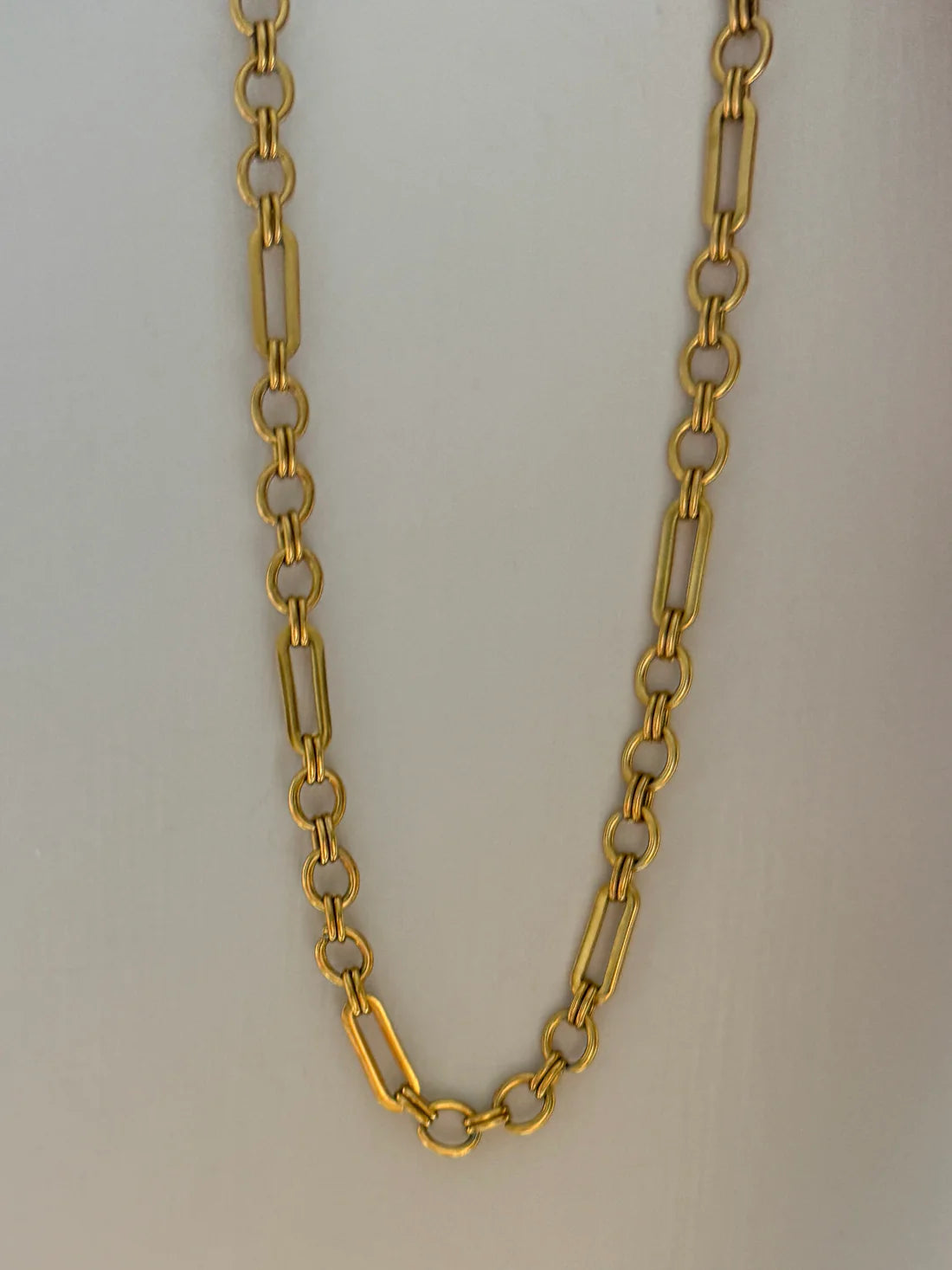 Add a touch of sparkle with The Ashely Necklace! This 15-inch beauty features water-resistant, 18k gold-plated stainless steel with charming oval and gold links. Durable and dazzling, it comes with a lifetime warranty to keep you shining bright every day. Perfect for adding a playful pop to any outfit!