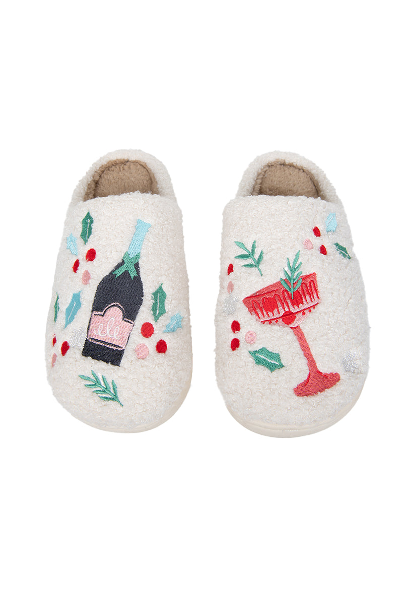 Celebrate the season in cozy style with our Holiday Champagne, Coupes & Holly Slippers. Wrapped in soft sherpa, these slippers bring festive cheer to your feet while keeping you warm and comfy. Perfect for sipping champagne or dancing around the holiday tree, they add a playful touch to your winter wardrobe. Step into holiday magic with every step!