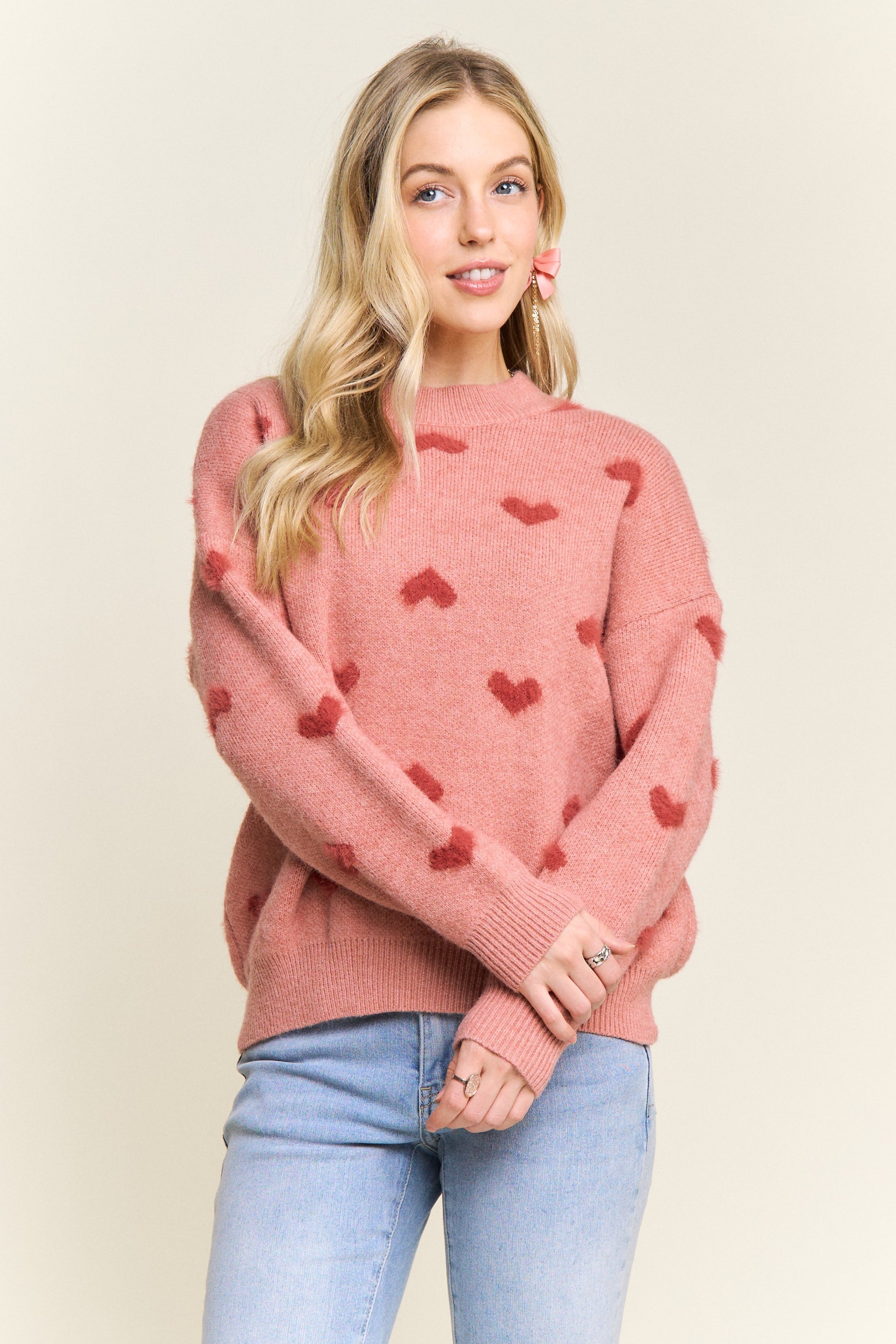 DROP SHOULDER HEART PATTERN SWEATER TOP PINK & RED : 52%ACRYLIC, 28%POLYESTER, 20%NYLON