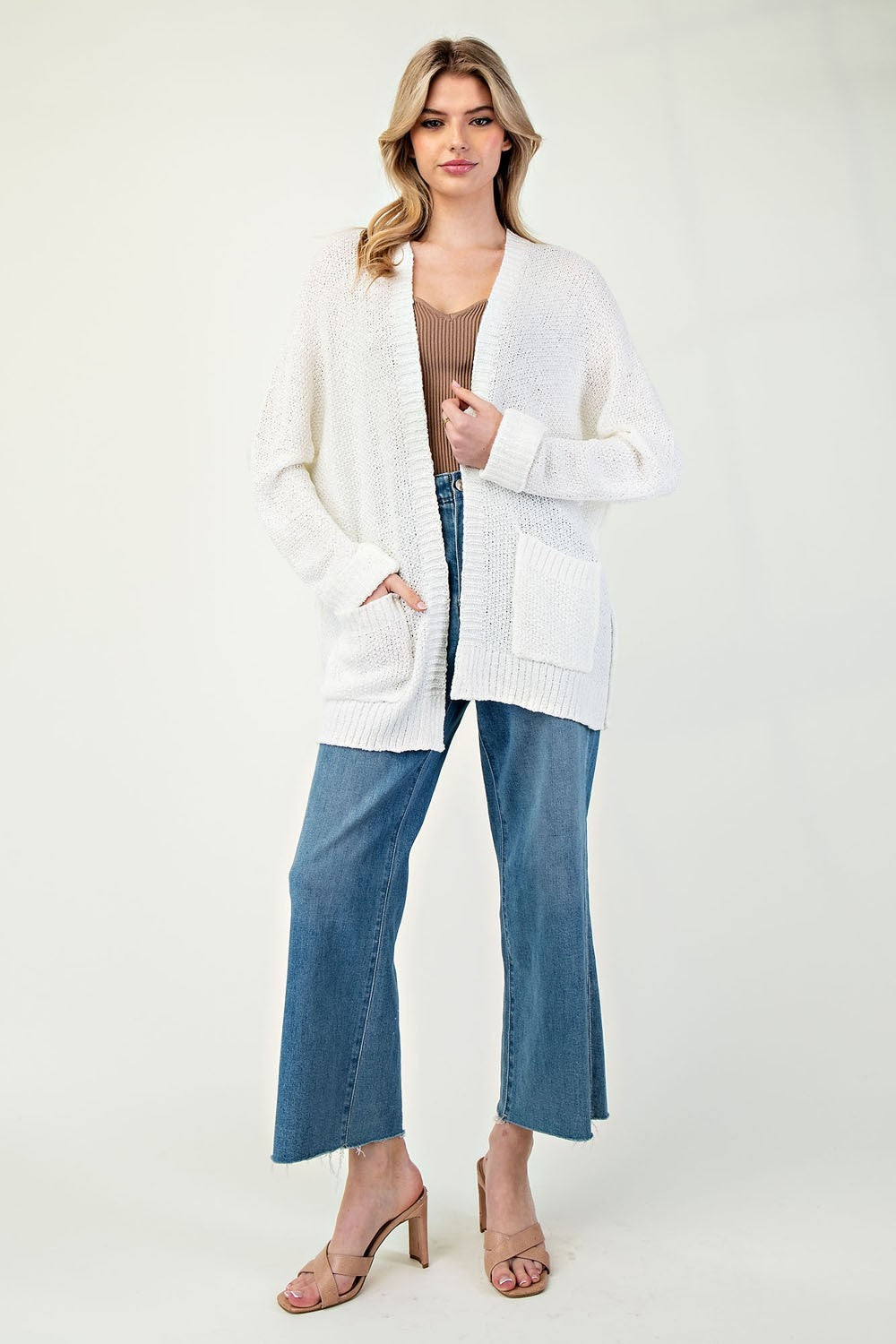 Cozy up in this slouchy knit cardigan, designed with an easy open front and handy pockets to keep your essentials close. Perfect for layering, it adds a relaxed vibe to any outfit while keeping you snug and stylish.