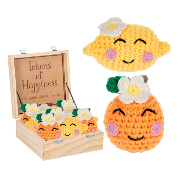 Add some happy to your life with the Citrus Token of Happiness! This unique token is a crocheted masterpiece, available in both lemon and orange. Featuring a charming crochet daisy and a smiling face, it's sure to brighten your day in a playful and quirky way.