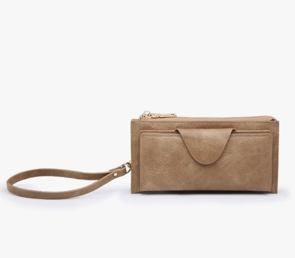 Kyla is one of our best-selling wallets! Features multiple card slots and an ID slot that snap closed, a zip change pocket, and a wristlet strap to carry it with ease. RFID safe! Made of vegan leather.