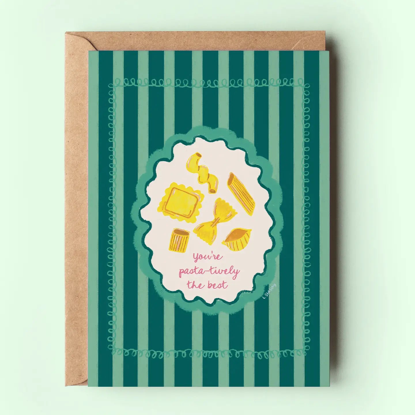 Send some carbs to a cutie with this punny 5x7 card, featuring watercolor pasta and the phrase "You're pasta-tively the best". The card is blank inside for your own personal message, and comes with a brown kraft envelope. Perfect for appreciation, celebrations, promotions, retirements, pasta lovers, thank yous and more!
